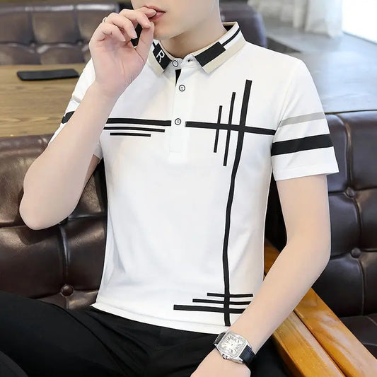 2023 Men's Knitted Jacquard Polo Shirt Casual Stripe V-Neck Solid Color Short Sleeve T-Shirt Breathable Light Luxury Clothing