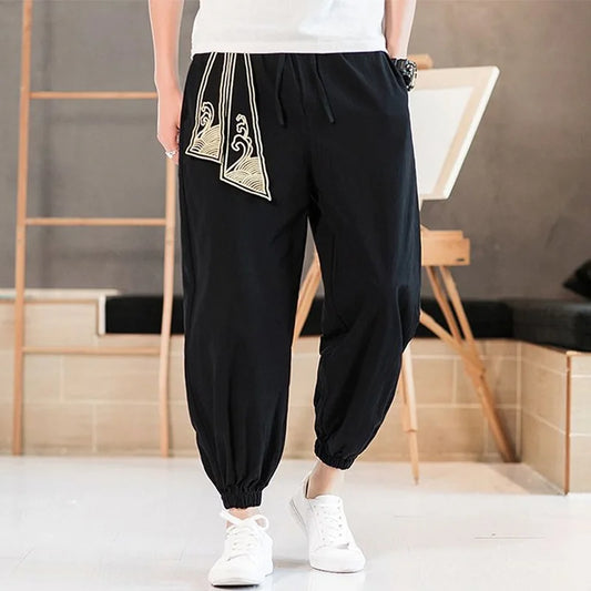 2023 New Spring and Autumn Chinese Style Embroidered Linen Sports Loose Casual Korean Version Trendy Men's Feet Cropped Pants