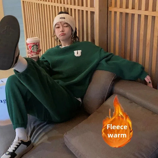 Women's Autumn Winter New Style Loose Fit Fleece Lined Thickened Casual Fashion Sports Suit Sweatshirt Trousers 2-piece Set