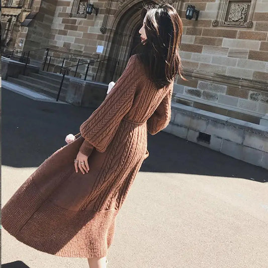 2024 Autumn Winter Lantern Sleeve Long Women Dresses Female Knitted Warm Dress Ladies A Line Knit Pullover Sweater Vestidos E13