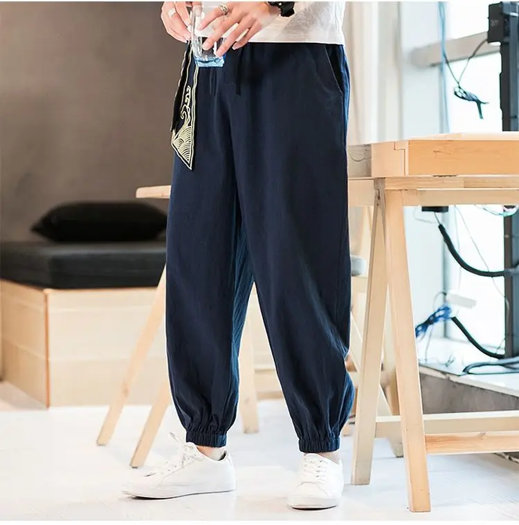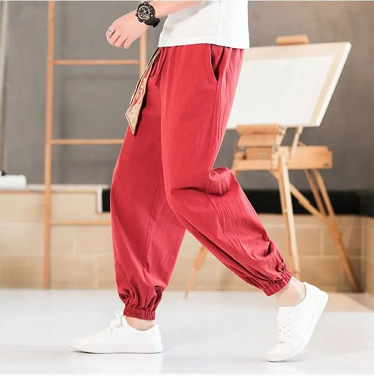 2023 New Spring and Autumn Chinese Style Embroidered Linen Sports Loose Casual Korean Version Trendy Men's Feet Cropped Pants