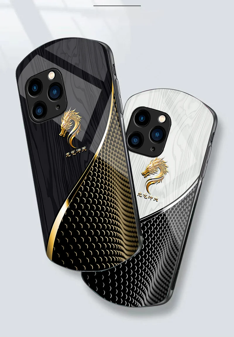 Wood Grain Dragon Qi For Iphone 11 12 13 14 15 Pro Max Plus Mini 7 8 Se 2020 X Xs Xr Elliptical Tempered Glass Phone Case