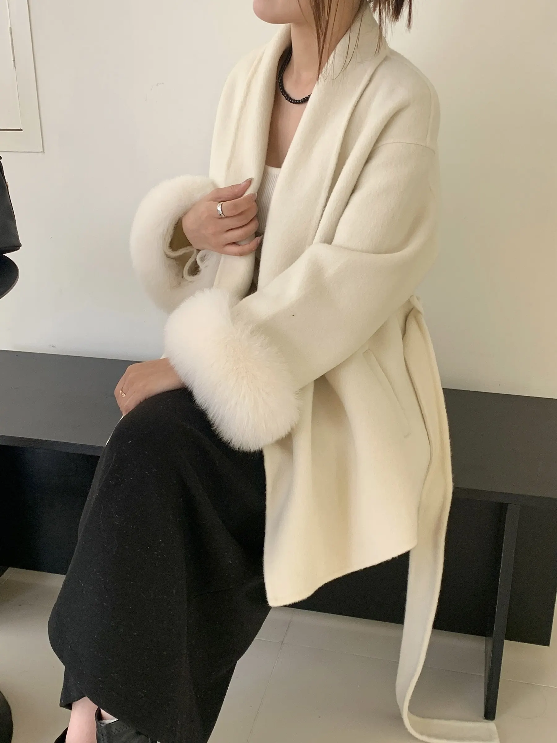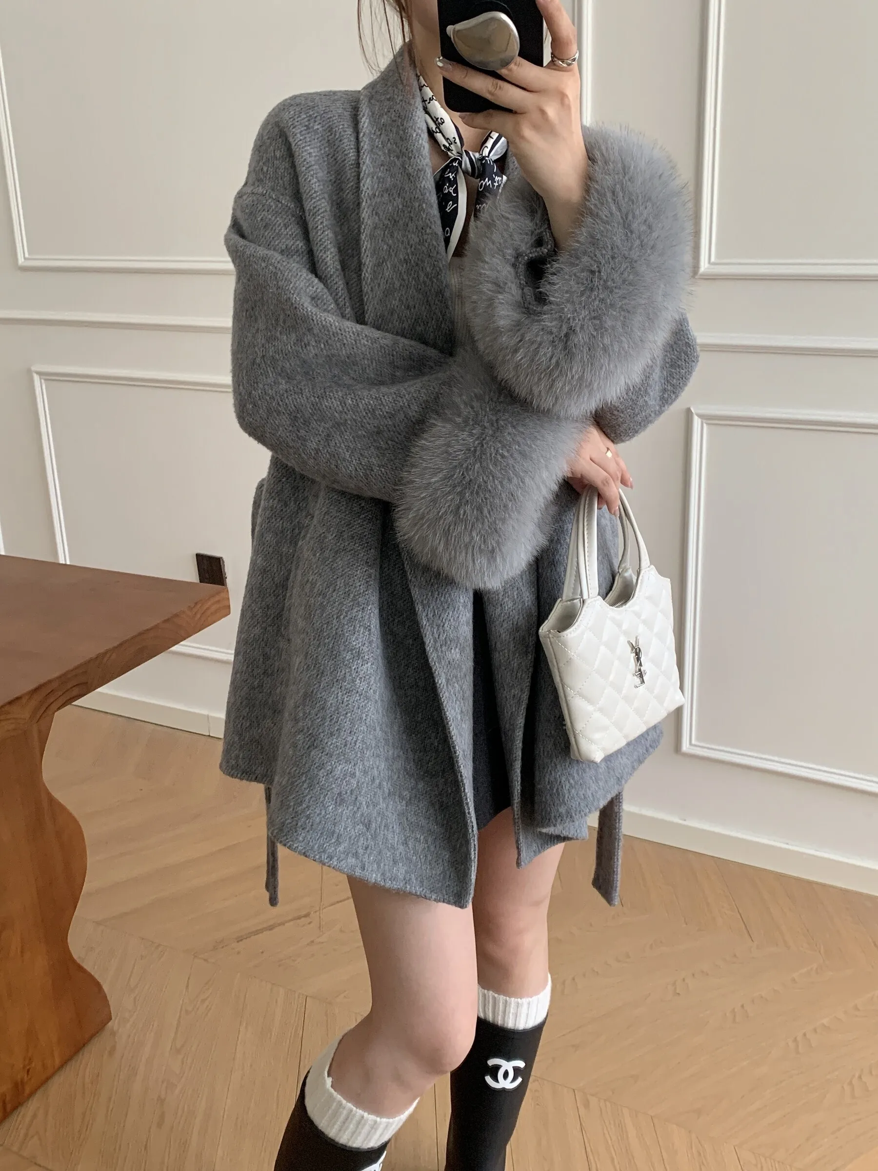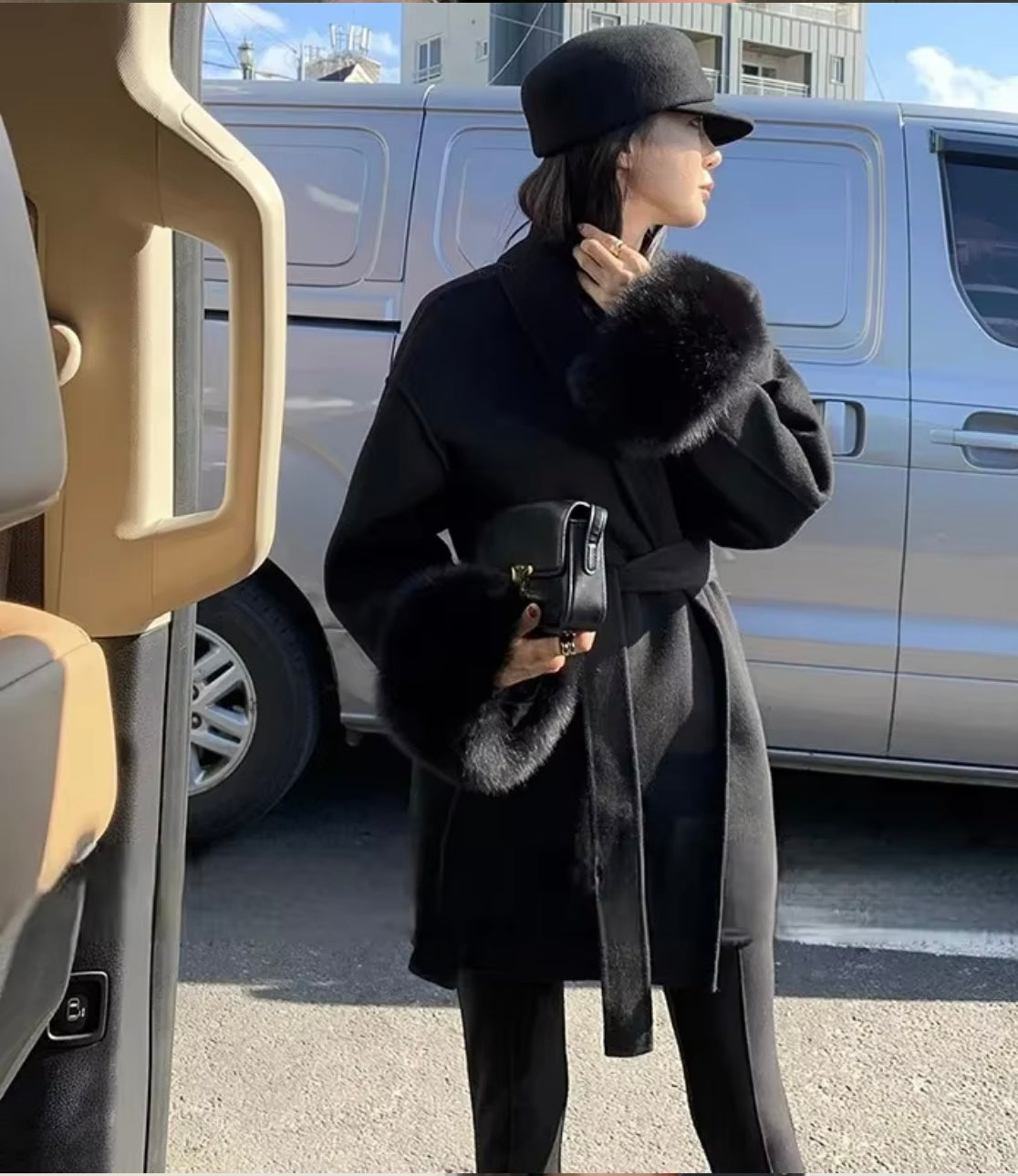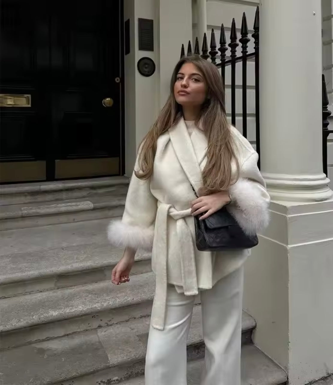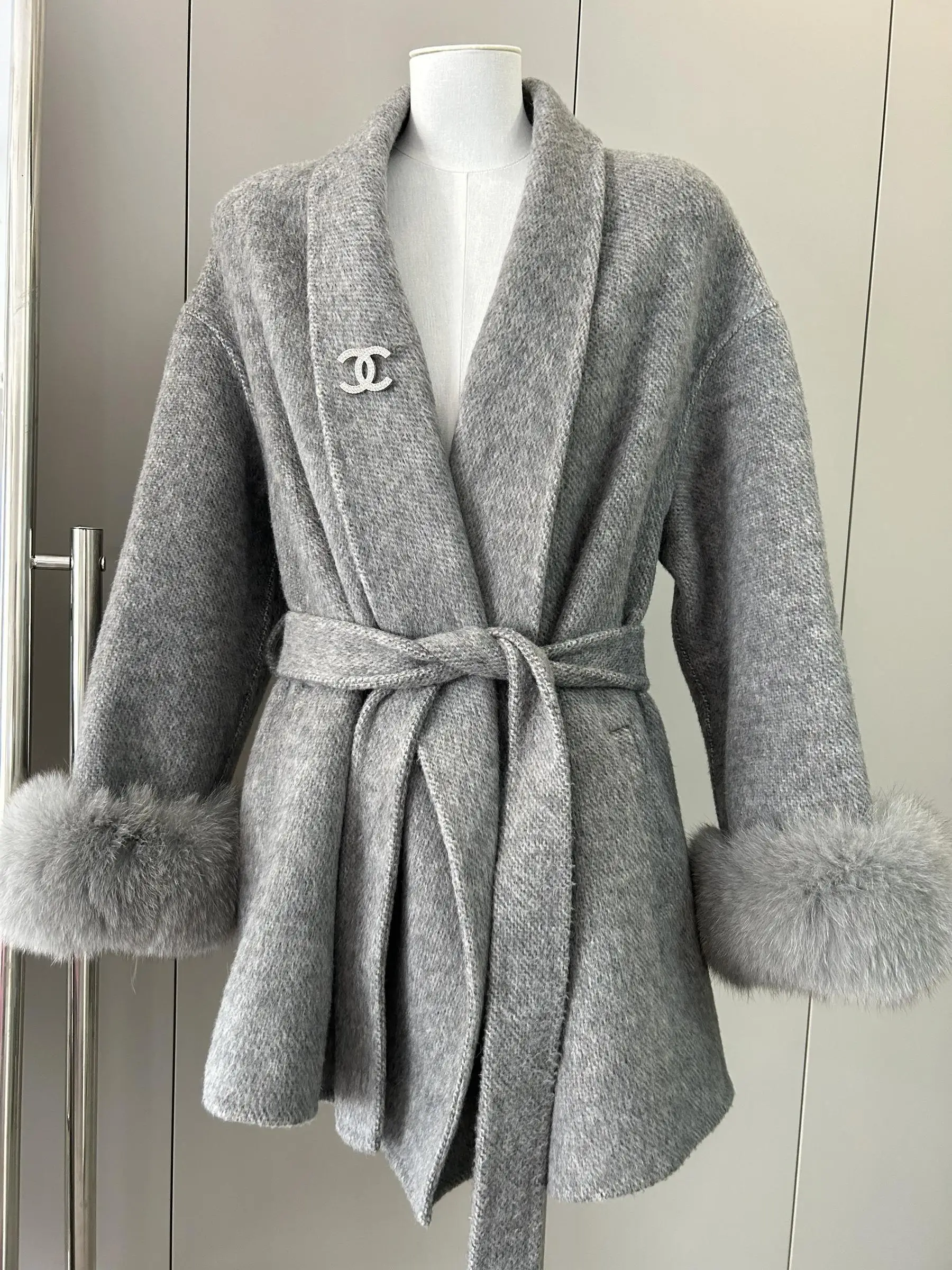Elegant women’s short cashmere coat with lapel and lace-up design. Soft woolen jacket for autumn and winter – warm, chic, and timeless.